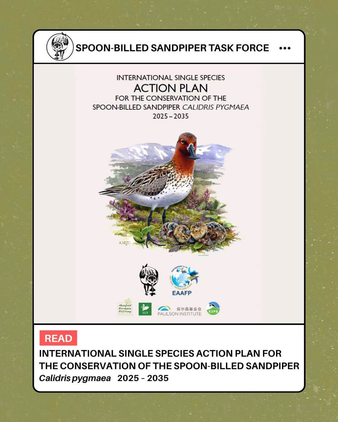 2025年5月,在内蒙古老牛慈善基金会的资助下,保尔森基金会联合红树林基金会启动了“全球勺嘴鹬保护行动计划”项目,支持更新并发布这一具有里程碑意义的全球保护计划。同年11月,《2025-2035年勺嘴鹬保护行动计划》在东亚-澳大利西亚迁飞通道伙伴关系(EAAFP)第12次缔约方大会(MOP)上正式获得签署并采纳。该计划凝聚了全球40余位专家的努力与贡献,也是一份承载着未来十年希望的蓝图。